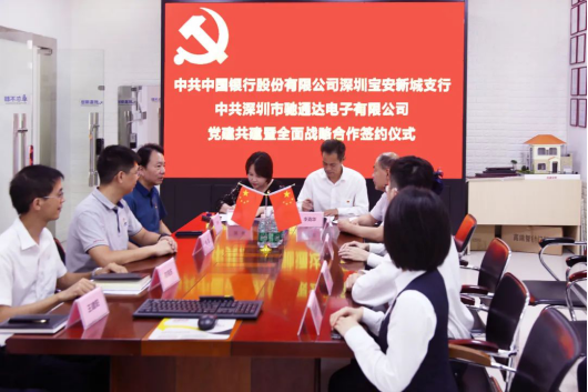 党支部隆重举行党建结对共建暨全面战略合作签约仪式。出席本次签约仪式的中行领导有:宝安管辖支行钟俊副行长,新城支行李克华行长,新城支行陈莉副行长,新城支行黄程林副行长等;出席本次签约仪式的驰通达集团领导有:集团董事长、南山区人大代表万腾驰,集团行政总裁、党支部书记莫蓉,轮值ceo、法人代表熊剑,财务部经理陈晓东等支委成员。中行领导对本次党建共建活动给予高度重视和大力支持,并对受疫情影响导致部分出口业务受阻的企业给予大力的授信额度支持,对驰通达集团日常经营和平稳发展提供了很大的帮助,此行深入基层企业传经送宝更是难能可贵,万腾驰董事长对此表示大加赞赏和感谢!